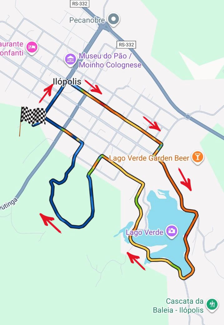 Saída do Parque do IBAMA, segue reto para a Rua Pedro Rossi até o fim da praça, dobra a direita na Rua Expedicionário segue até o cemitério, desce na Rua Encantado, dobra a esquerda sentido o Lago Verde, contorna o Lago Verde, segue na Rua Augusto Tomasini, dobra a esquerda na Rua Luiz Bresolin sentido a estrada de chão, faz a estrada e volta pela Rua Doutor Jorge Brunetto, dobra a esquerda na Augusto Tomasini e segue até o Parque do IBAMA. Caso chova não será feito o trajeto na estrada de terra, seguirá do Lago Verde reto pela Rua Augusto Tomasini até o Parque do IBAMA.